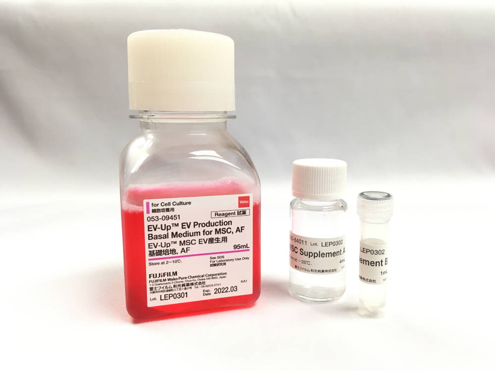 In addition, FUJIFILM Wako has developed an optimized medium for the production of MSC-derived EVs. It has been reported that EVs released from mesenchymal stem cells, among other types of cells, show therapeutic effects by transferring cargoes, such as lipids, proteins, RNAs, and DNAs to recipient cells. This has led many researchers to focus on the therapeutic applications of EVs. While researchers are seeking for the optimum conditions for MSCs to secret EVs, they have successfully launched a new medium, EV-Up™. This medium is a serum-free and animal-free medium and enhances EV production from MSCs without compromising their functionality.
