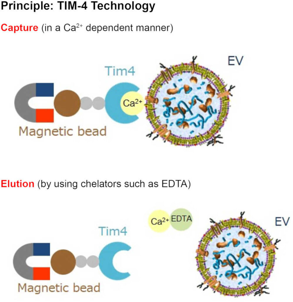 FUJIFILM Wako has developed an extremely efficient EV isolation kit (PS affinity method) based on the Tim4 protein, which specifically binds to phosphatidylserine (PS) on the surface of EVs lipid bilayer in the presence of Ca2+-ions. For elution of the captured EVs from Tim4, functionalized on magnetic beads, a chelating agent (EDTA) is used to remove calcium ions, so that purified exosomes are released under mild and physiological conditions. This leads to almost intact EVs with very low levels of contaminants and it provides EVs for functional research. This EV isolation method has better recovery efficiency, purity, collection of intact vesicles, and reproducibility than conventional methods. EVs from various animal species and samples, such as a human, mouse, and bovine can be purified.