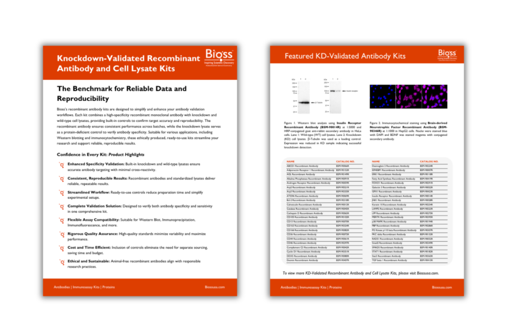 Achieve reliable, reproducible results with Bioss‘ KD-validated recombinant antibodies and cell lysate kits. Designed to simplify and enhance your antibody validation workflows, ensuring consistent performance across experiments.