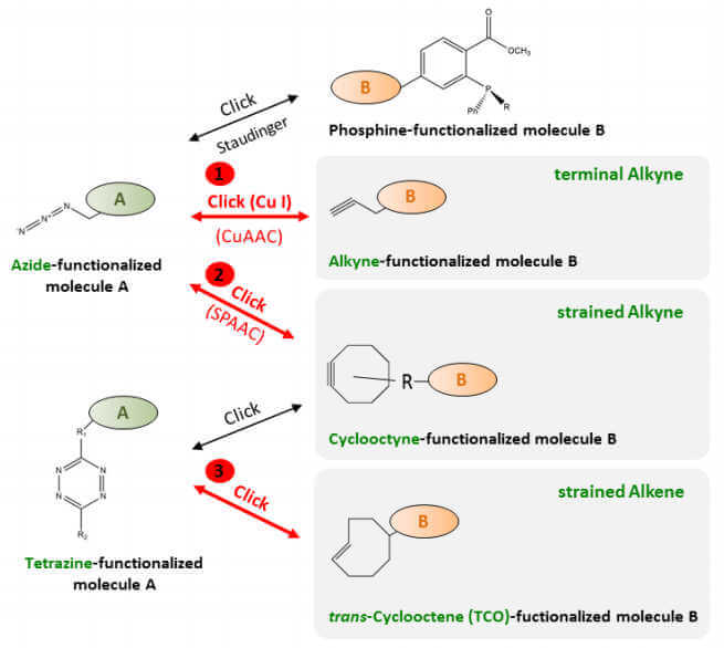 Activation of molecule A and B Compatible CLICK-functional groups are introduced via CLICK Reagents