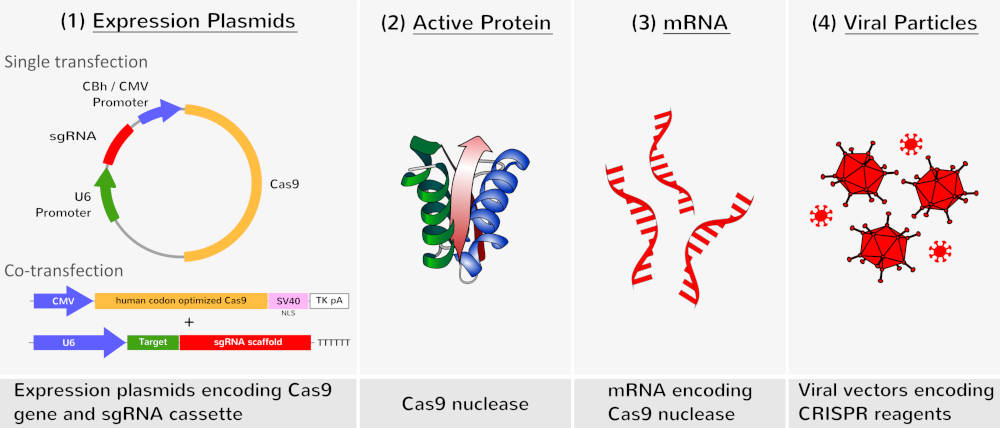 For generation of cellular models, Cas9 and the designed sgRNA (a chimeric RNA containing all essential crRNA and tracRNA components) can be introduced into the target cells. The type II CRISPR/Cas system only needs a single Cas protein that can be expressed into target cells by: (1) plasmid transfection, (2) direct delivery of the active Cas9 endonuclease, (3) transfection of mRNA encoding for Cas9 or (4) by viral vectors transduction.