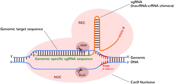 In 2013, four groups demonstrated that CRISPR/Cas9 associated with guide RNA can be used for gene editing [2-5]. Based on the type II CRISPR/Cas9 mechanism, researchers created a single guide RNA (sgRNA), which is able to bind to a specific dsDNA sequence. This resulted in double strand breaks (DSB) at target site with: (1) a 20-bp sequence matching the protospacer of the guide RNA and (2) a protospacer-adjacent motif (PAM) 3 bp downstream NGG sequence. CRISPR/Cas9-mediated genome editing thus depends on the generation of DSB and subsequent cellular DNA repair process. The presence of DSB in the DNA generated by CRISPR/Cas9 leads to activation of cellular DNA repair processes, including non-homologous end-joining (NHEJ)-mediated error prone DNA repair and homology-directed repair (HDR)-mediated error-free DNA repair. Insertions and deletion mutations at target site generated by NHEJ and HDR allow disrupting or abolishing the function of a target gene. Moreover, modifications in this system can also be used to silence gene, insert new exogenous DNA or block RNA transcription.