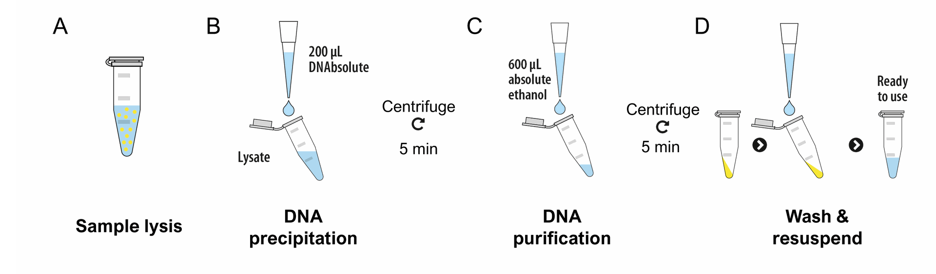 Our DNAbsolute kit contains the DNAbsolute solution as well as some lysis, PBS and Tris buffers. All you need to have on your side is a refrigerated centrifuge, ethanol and proteinase K. You can also add an RNase treatment if needed.
