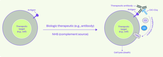The complement system is a network of 50+ individual proteins, protein complexes and fragments that drive a host’s innate immune response via three main pathways: alternative, classical and lectin. Complement-dependent cytotoxicity (CDC) is the natural mechanism by which therapeutics, most often humanized antibodies but also other non-antibody proteins and peptides, activate the complement system. This ultimately leads to the formation of the membrane attack complex (MAC), clearance of non-host materials and additional immune system response.
