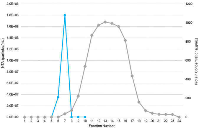 From fractions 1 to 5, no exosomes were eluted from the Exo-spin™ miniHD column. Fractions 6 and 7 contain the exosomes, with peak exosome concentration in fraction 7, and ultra-low protein contamination in both of these fractions. The vast majority of proteins present in the sample elute in the subsequent fractions.