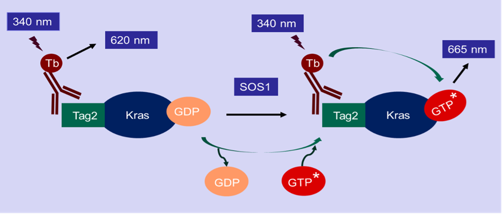 Their TR-FRET-based Nucleotide Exchange Assay enables precise measurement of GTP binding to KRAS in the presence of SOS1, a key guanine nucleotide exchange factor (GEF). The assay utilizes a Terbium-labeled anti-Tag2 antibody (HTRF donor) to detect fluorescence-labeled GTP binding to KRAS. Upon excitation at 340 nm, energy transfer occurs, producing a measurable fluorescence signal at 665 nm. This assay provides a quantitative method to evaluate nucleotide exchange activity, with inhibitors reducing the HTRF signal.