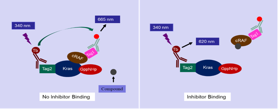 The TR-FRET-based KRAS-cRAF Binding Assay is designed to detect interactions between activated KRAS (loaded with GppNHp) and cRAF. The assay employs a Terbium-labeled anti-Tag2 antibody (HTRF donor) for KRAS and a fluorescence-labeled anti-Tag1 antibody (HTRF acceptor) for cRAF. When KRAS binds to cRAF, fluorescence resonance energy transfer (FRET) occurs, enabling quantitative measurement of the interaction.