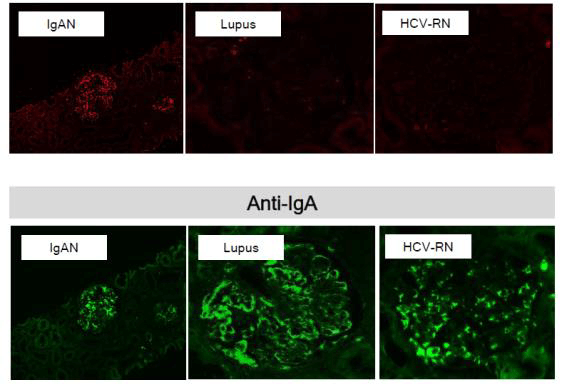 IBL’s monoclonal antibody, Anti-Human Gd-IgA1(KM55) Rat IgG MoAb (10777), can detect Gd-IgA1 in tissue by IHC technique differently from the feature of HAA lectin and it has been revealed that Gd-IgA1 specifically exists in glomeruli of the patients of IgAN.