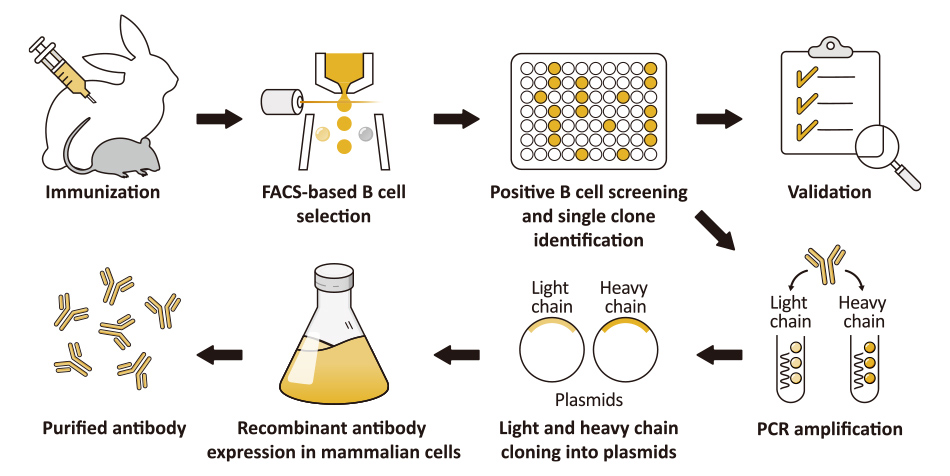 The production workflow involves isolation of antigen-specific IgG+ memory B cells from immunized animals using fluorescence-activated cell sorting (FACS) (Fig. 1) (1). These cells are then cultured individually and undergo further analysis and testing for one or more applications of interest. This approach preserves the pairing of the matched heavy and light chains from the same B cell, with the respective chains from the most promising cell clones subsequently introduced into plasmids in an IgG format. These plasmids can then be transfected into mammalian cells for scalable production whenever necessary. Importantly, though plasmid cloning makes antibody engineering very straightforward, performing this process in rabbits offers the benefits associated with the rabbit immune system: large lymphocyte pool, enhanced binding affinity, simpler Ig structure, and broader antibody repertoire (2). In the GeneTex catalog, these new recombinant monoclonal antibodies are designated by the “HL” in their clone name.