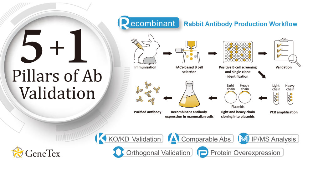 The manufacturing process is based on the approach described by Starkie et al. (2016) (1). The technique employs a multi-parameter fluorescence-activated single cell sorting (FACS) methodology to select antigen-specific IgG+ memory B cells from an immunized rabbit. The antibody variable region genes from selected cells are then cloned into an IgG backbone and introduced into mammalian cells for expression. This technique is particularly advantageous because it allows for the cloning of both heavy and light chains from the same B cell, thereby maintaining natural pairing. Furthermore, the manufacturing sequence enables pre-validation through application-specific assessments, such as western blot (WB), immunohistochemistry (IHC), and immunocytochemistry (ICC/IF), during clone selection. Successful antibodies then undergo a strict evaluation process based on GeneTex’s 5+1 Pillar Validation Plan (Figure 1), which relies on siRNA knockdown or CRISPR-generated knockout lysates as well as four other validation strategies outlined in the landmark Uhlen et al. (2016) study (2).