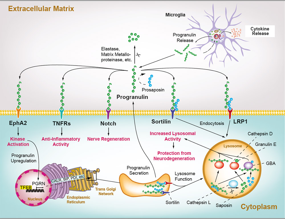Progranulin (PGRN) is a cysteine-rich protein, composed of seven ~6kDa granulin (GRN) proteins, that shows multifunctional biological activities, including major roles in cancer, inflammation, metabolic disease and neurodegeneration, especially as a valuable biomarker for Frontotemporal Lobar Degeneration (FTLD). PGRN is an abundant, non-conventional, stress-induced, extracellular matrix-bound secreted growth factor-like molecule and cytoplasmic chaperone, that functions in a cellular and disease specific pattern. PGRN binds to several functionally different receptor families in a cell/tissue specific and condition/disease-dependent manner. For example, PGRN binding with TNFR and DR3 has an important anti-inflammatory role in immune cells, particularly Tregs and macrophages. PGRN/Ephrin type-A receptor 2 (EphA2) interaction is involved in the proliferative influence of PGRN. PGRN binds and activates Notch receptors, enhancing the regenerative capacity of injured neurons. PGRN is also a lysosomal resident protein and sortilin and lipoprotein receptor-related protein 1 (LRP1) have been demonstrated to be the lysosomal trafficking receptors for PGRN with the help of Prosaposin. In the brain, PGRN is primarily expressed in mature neurons and microglia. Absence of progranulin in microglia causes increased production and release of multiple cytokines, suggesting that PGRN regulates microglia activation. PGRN seems to affect microglial proliferation, recruitment, differentiation, activation and phagocytosis, suggesting that PGRN plays a central role in the regulation of neuroinflammatory responses. In neurons, PGRN i) co-localizes in late endosomes and early lysosomes with the transmembrane protein TMEM106B, ii) co-localizes with markers such as BDNF along axons, iii) influences synaptic structure and function at synaptic and extra-synaptic sites, where it is secreted in an activity-dependent manner, and iv) extracellular PGRN is endocytosed and delivered to lysosomes. The lysosomal function of PGRN is not well characterized, but probably involves regulation of proteins such as cathepsins, glucocerebrosidase (GBA) or TMEM106B and likely contributes to neurodegeneration.