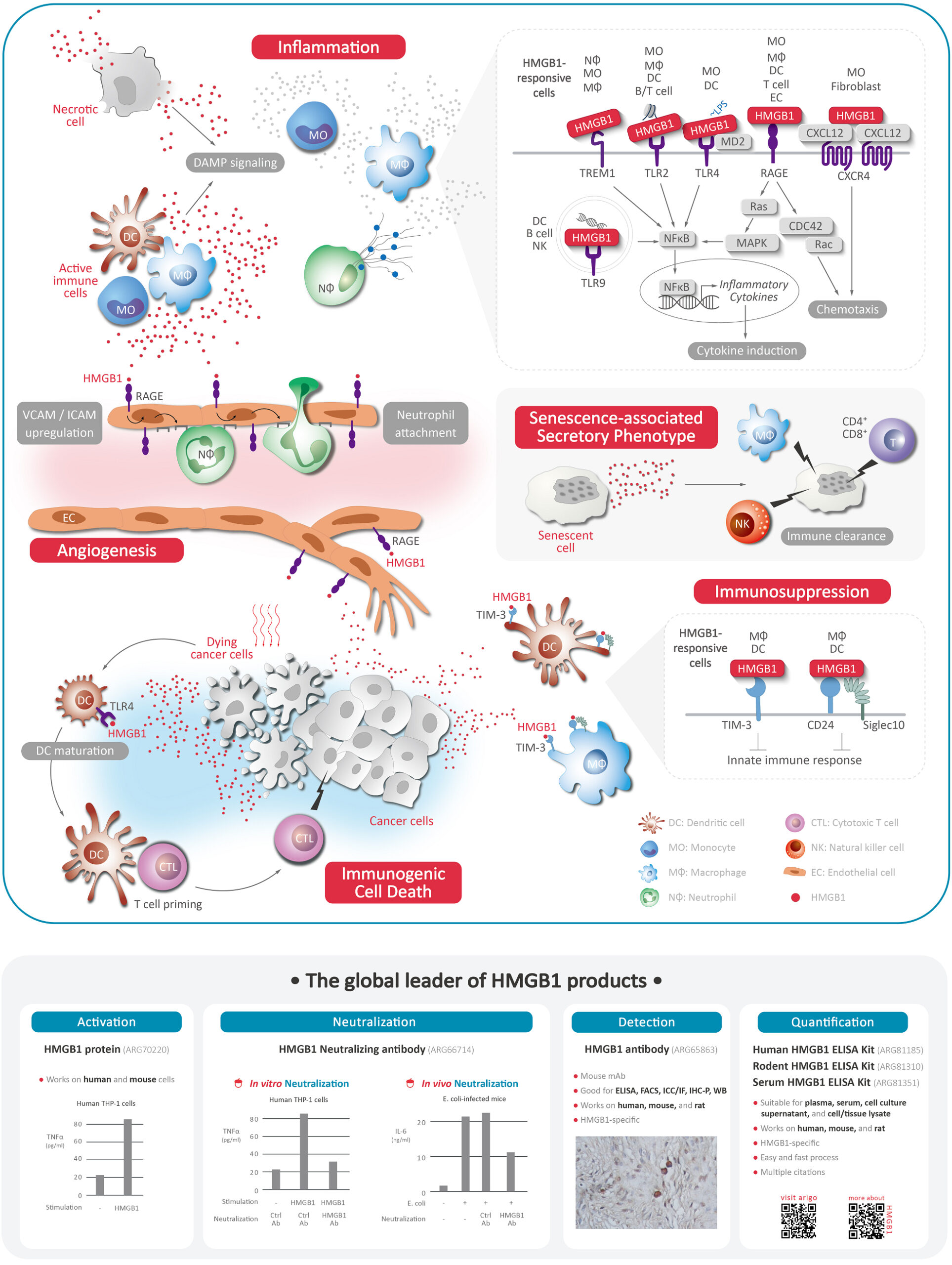 In the extracellular compartment, HMGB1 is passively released by necrotic cells and acts as a chemokine and DAMP (Damage-associated molecular pattern) to trigger inflammatory responses. Besides, HMGB1 is also secreted from activated dendritic cells and macrophages and functions as a cytokine, it acts as a ligand for RAGE, TLR-2 and TLR-4 thus activating the signal pathways and the following inflammation responses. Elevated HMGB1 levels are found in various pathological conditions such as acute poisoning, infection, sepsis, myocardial infarction, and inflammatory diseases.