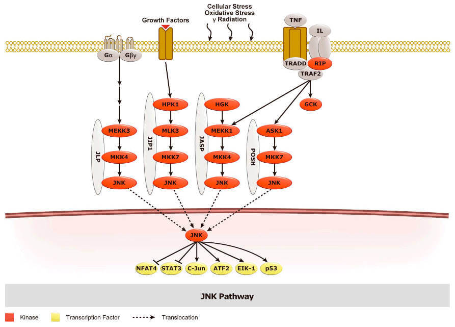 The c-Jun-N-terminal kinase (JNK) pathway is one of four major mitogen-activated protein kinase (MAPK) pathways in mammals. Receptor-initiated signals generated by cell exposure to stress, cytokines, pathogens, toxins, or drugs activate the JNK pathway through MAP4Ks and the three-Ievel (MAP3K / MAP2K / MAPK) kinase backbone that culminates in activation of the MAPK JNKs. Activated JNKs target at least 50 substrates including transcription factors and mitochondrial proteins Regulation of these substrates by the JNKs directly impacts pivotal cellular processes involving cell fate, inflammation, metabolism, and carcinogenesis.