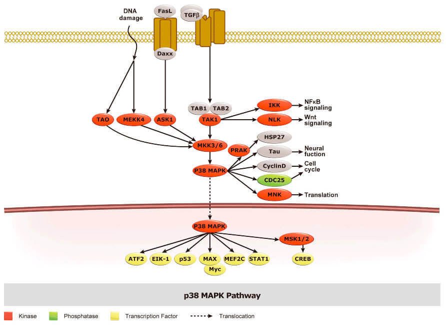 The p38 MAPK pathway is one of four MAPK systems in mammals that mediate cellular responses to external stimuli including stress and cytokines, among many others. The p38 MAPKs (α, β, γ, and δ), which are situated at the end of the canonical three-tier kinase cascade that is characteristic of these MAPK pathways, are intimately involved in fundamental cellular processes such as proliferation, differentiation, apoptosis, and metabolism. They also appear to be central players in many clinically important conditions, including autoimmunity, neurodegenerative disease, and cardiac ischemia.