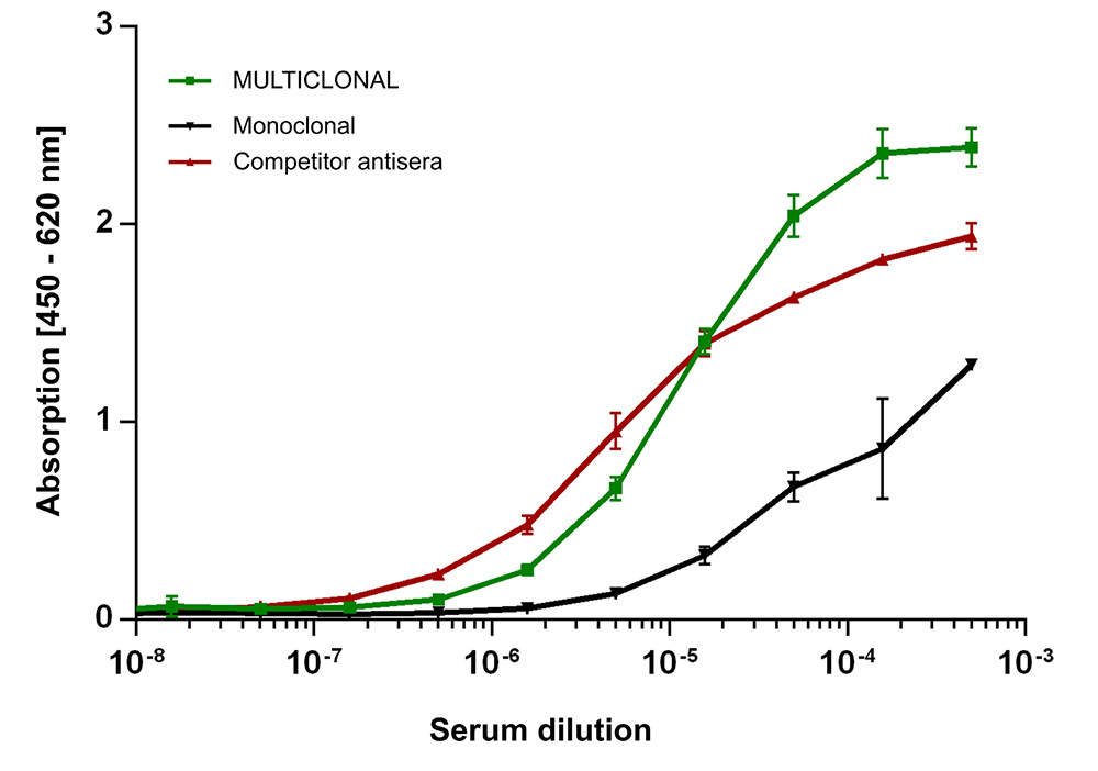 The presence of immunoglobulins with unknown specificities can lead to unwanted reactivity in animal sera. Multiclonals reveal a considerably lower cross-reactivity compared to animal-derived 2nd antibodies in ELISA and are a preferred solution in assays where high specificity and low background are required.