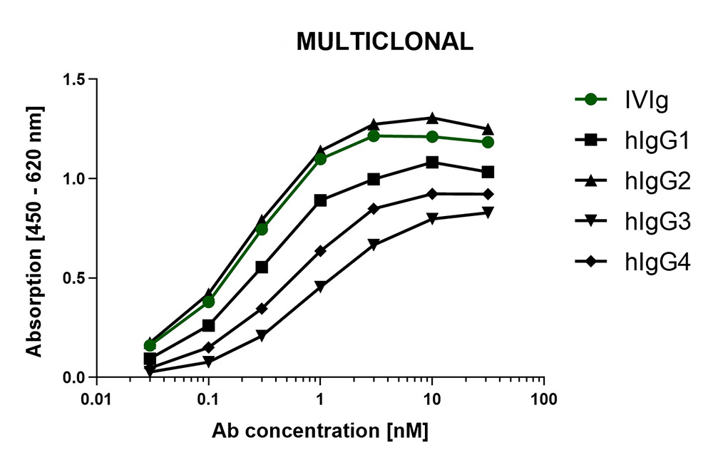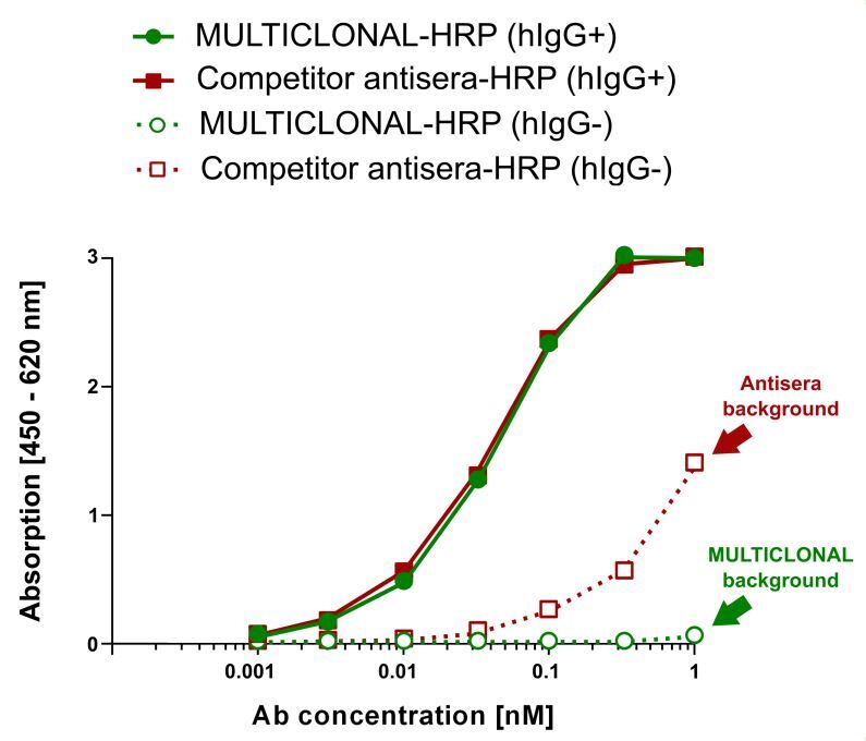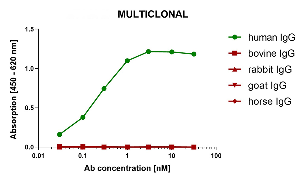 Multiclonals have a predesigned cross-reactivity profile and show specific binding to human IgG. Each individual antibody of the multiclonal mix is selected for its absence of cross-reactivity towards immunoglobulins of other species during phage display panning on antigens.
