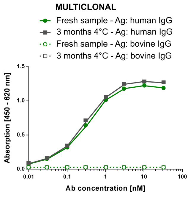 Unlabeled multiclonals can be stored for several months at 4°C without risk of harming their binding activity. Each antibody of the multiclonal mix has been selected for high stability and long shelf life and has been tested in stress tests to tolerate 45°C, freeze-drying process-induced stress and >25 freeze/thaw cycles.