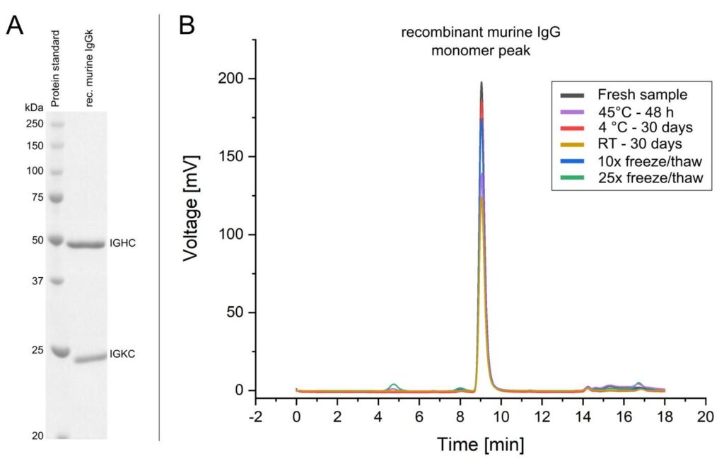 Every antibody of the multiclonal mix is individually tested in coomassie brilliant blue-stained SDS-PAGE and size exclusion chromatography to exclude the presence of impurities and aggregate formation. Molecular weight distribution is assessed after long-term storage and protein stability stress tests. The multiclonal mix antibodies remain monomeric and stable over time despite thermal and physical acute stresses.