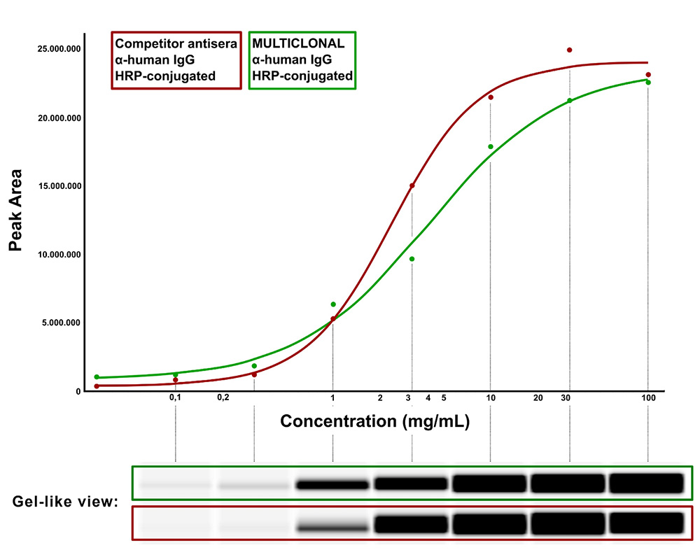 Multiclonal anti-human IgG-HRP shows comparable binding and higher dynamic range compared to typical animal-based secondary antibodies when used in quantitative immunodetection with the automated Protein Simple Western Immunoassay system.