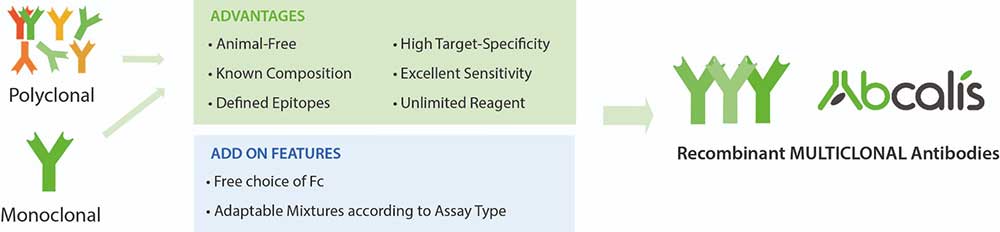 Multiclonals are recombinant secondary antibodies developed by AdipoGen Life Sciences innovative partner Abcalis. They consist of defined mixtures of carefully selected individual recombinant monoclonal antibodies, recognizing different epitopes on all four different subclasses of human IgG. Their respective epitope binding sites do not compete with each other, therefore amplifying signal strengths. Multiclonals are an ideal solution for secondary antibody applications where a polyclonal antibody would traditionally be used, and are able to provide the specificity and reproducibility only available from a recombinant antibody, making them an ideal alternative for diagnostic and research applications.