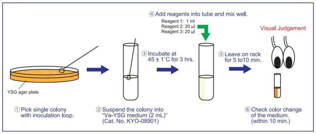 The reagents on this page provide a simple, rapid, and efficient procedure to detect guaiacol producing TAB. In this method, individual TAB colonies isolated from a test article (i.e., colonies surviving 18-20 hours culture at 45 C on acidic YSG Agar plates) are cultured in Va-YSG (Va = vanillic acid) medium before testing the broth for the presence of guaiacol by a sensitive enzymatic assay. Va induces the expression of genes that facilitate guaiacol synthesis, maximizing guaiacol and thus helping to insure that all colonies capable of forming guaiacol will be detected.