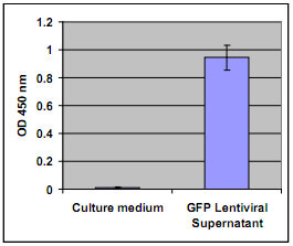 One disadvantage of using a traditional p24 ELISA to quantify lentivirus is the overexpression of p24 during lentiviral packaging. Free p24 protein may account for a substantial portion of total p24 in lentiviral supernatant. The traditional p24 ELISA detects both virus-associated p24 and free p24 generated by 293T cells during transient transfection. The QuickTiter™ Lentivirus Titer Kit minimizes the overestimation of p24 in lentivirus supernatant. The proprietary technology separates the lentivirus-associated p24 from free p24 protein prior to performing the ELISA.