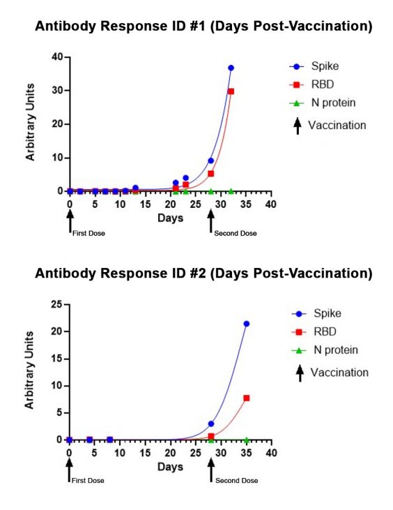 In 2021, Salimetrics released the SARS-CoV-2 IgG Antibody Assay Panel 3-Plex (S-Protein, N-Protein, & RBD), featuring a 98.8% specificity and a 96.5% specificity, as part of their laboratory testing offering. This assay was specifically validated for use without specialized collection devices. The SARS-CoV-2 IgG Antibody Panel can also effectively track the antibody response to the vaccine or a natural infection over time and provides relative levels by including a reference standard. Below are representative performance data from individuals starting on the first day of immunization with the Moderna vaccine through a week after receiving their second dose of the vaccine. The lack of N-protein reactivity (shown in green) distinguishes the SARS-CoV-2 vaccination since the vaccine does not encode N-protein. In the graph below, you can see a moderate increase in Spike/RBD reactivity up to the second immunization (indicated by arrow) and the exponential increase in reactivity post-second immunization.