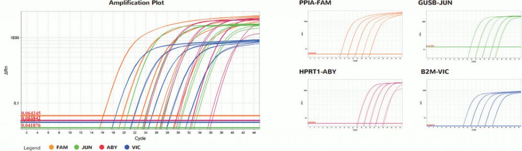 Solis BioDyne has optimized their reagent composition for excellent performance in highly multiplexed reactions while making sure you don’t lose in sensitivity compared to singleplex or duplex assays. Figure 1 shows excellent simultaneous amplification of 4 targets.