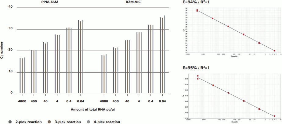 SOLIScript 1-step Multiplex Probe Kit shows trustworthy quantification whether you want to detect 2 or 4 targets in the same reaction. Figure 2 illustrates that the sensitivity for amplifying PPIA and B2M genes across 6 orders of magnitude is not affected by additional plexes.