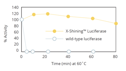 Modified thermostable X-Shining™ Luciferase allows sensitive bioluminescent environmental monitoring, ATP testing and bacterial identification in microbial assays.