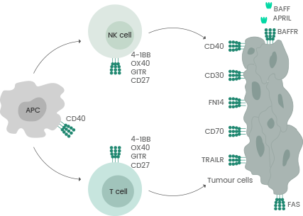 TNFRSF molecules and ligands are targeted on cells of the immune system to boost immune activity against a tumor cell or on tumor cells to either directly promote apoptotic cell death or focus cytotoxic mechanisms toward a tumor cell.