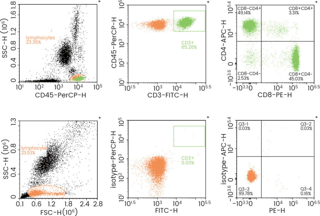 CD3/CD4/CD8/CD45 is used to detect the expression of CD3, CD4, and CD8 in human biological specimens, and to analyze leukemia and lymphatic subgroups. This panel can identify the percentage and absolute counts of mature T lymphocytes (CD3+), helper T lymphocytes (CD3+CD4+) and cytotoxic T lymphocytes (CD3+CD8+) subsets from whole blood samples.