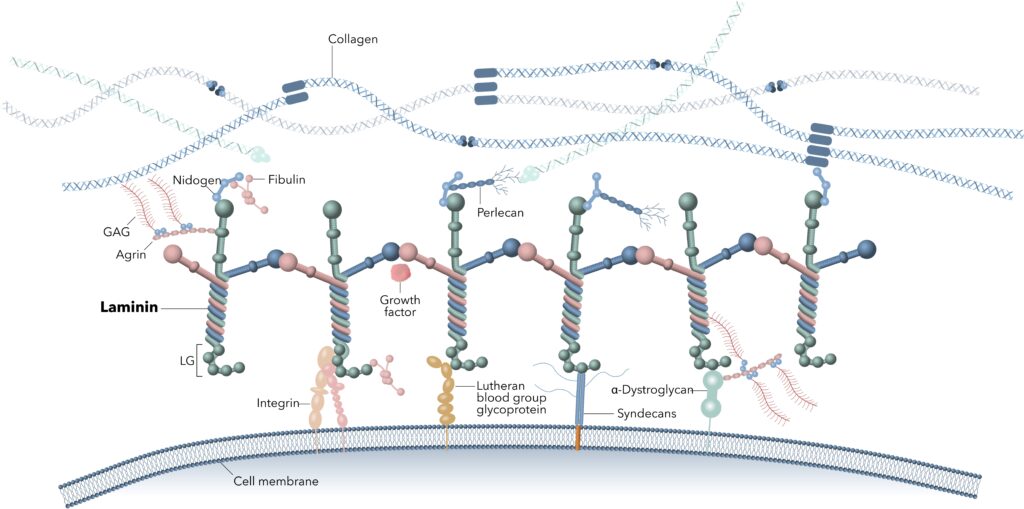 Laminins are large extracellular matrix proteins. Their full-length structure, preserved over time in evolution, is critical—shorter forms would not fulfill the functional requirements demanded by cells. Laminins use the entire protein structure to not only interact with various ECM factors and cell receptors but also to self-polymerize, forming stable networks crucial for their function. Even minor modifications to the amino acid sequence can result in severe diseases or lethality, further showing the necessity of its intact structure for full biological functionality.